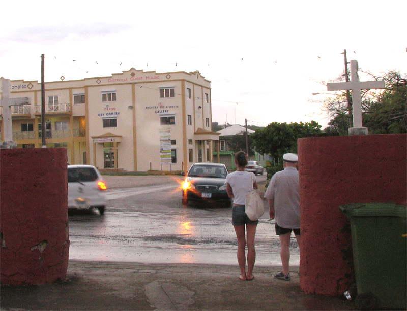 Délután Rékával és Zolival kimentünk a partra, ahol egy helyi boltos hívott nekünk taxit, T1 volt a rendszáma. Rékus lealkudta a viteldíjat 15 dollárra, így jutottunk be "a" városba, The Valley-be, ez egyben a főváros is. Ősszejöttünk egy aranyos fogatlan öreglánnyal, Christine-nel, aki lelkesen dícsérte a szigetet és csak kicsit volt alkoholszagú.