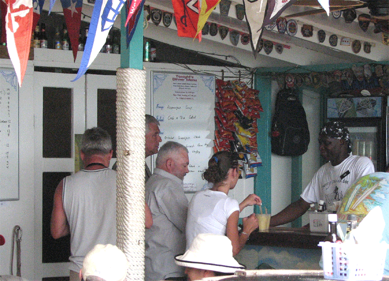Reggeli után, bő 3/4-es, 24-26 csomós szélben, csak a génuával átmentünk az 5 mérföldre lévő Jost van Dyke-re. A White Bay-ben bólyára kötöttünk, nincs is más lehetőség. Viszont itt van a híres Soggy Dollar Bar, itt született a painkiller nevű koktél. A pohár tele jéggel, harmadáig rum, erre egy narancs-mangó- kókuszlé keverék, shakerből. Mit ne mondjak, itatja magát :-) |