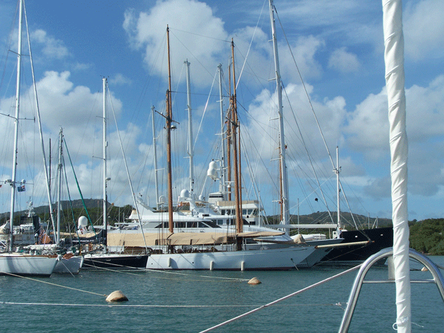 Reggel jó negyed széllel végigjöttünk St. Kitts partjai előtt egészen Basseterre-ig, ennek kikötője Port Zante. Szerencsére volt egy üres hely a baloldalon, orral álltunk a partnak, farral bóján. Volt egy kis gubanc, a hajócsavarral feltekertük a bójához menő kötelet, de Zoli vízbe vetette magát és letekerte.