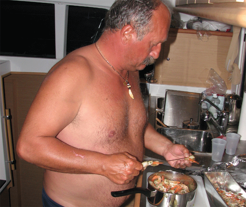 Kimotoroztunk a kikötőből Orient Bay-be beachelni. Láblógatás után Tibivel és Zsoltival nekiálltunk főzni. A rákokhoz való creole-szószom majdnem olyan jó volt mint a Green House-beli. Tibi paprikás krumplit csinált csipetkével, tréningezte a fiukat a hazamenetelre.