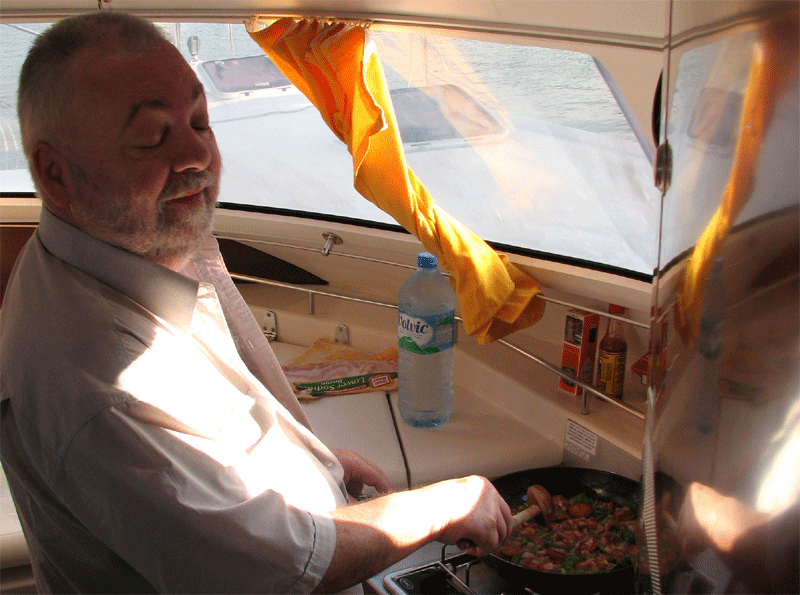 Késő délután visszahajóztunk és a kikitő mellett horgonyt dobtunk. Közkívánatra ismát karibi rákot főztem, másik fogásnak meg olaszos spagettit. Nem votl panasz :-) |