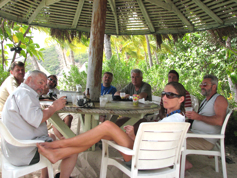 A reggeli tökörészés után átmentünk Beef Island-ra, ott van a repülőtér, valami gond támad a repjegyekkel,ezt kellet megoldani. A legközelebbi öböl a Trellis Bay, ott kötöttünk bójára. Zsolti és Pisti kimentek a reptérre, mi meg átkötöttönk Marina Cay-be, este ott buli lesz. Ez egy kis sziget Great Camanoe és Scrub Island között, csak egy szórakoztató műintézet van rajta.
